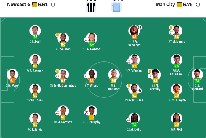 纽卡斯尔联首发:1-波普、3-刘易斯·霍尔、4-博特曼、12-佳夫、7-乔林顿(87’2-特里皮尔)、39-吉马良斯、41-雅各布·拉姆塞(70’8-托纳利)、67-麦利、9-维萨(70’27-沃尔特马德)、10-戈登(70’20-伊兰加)、23-雅各布·墨菲,